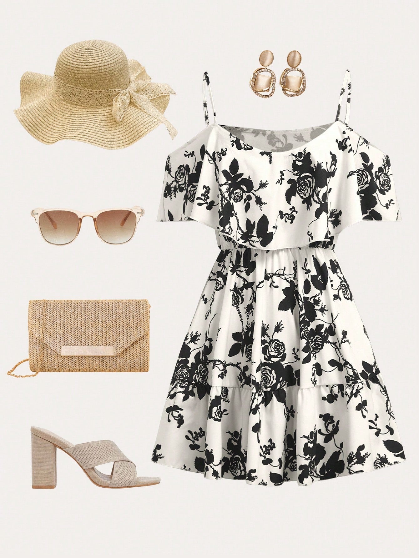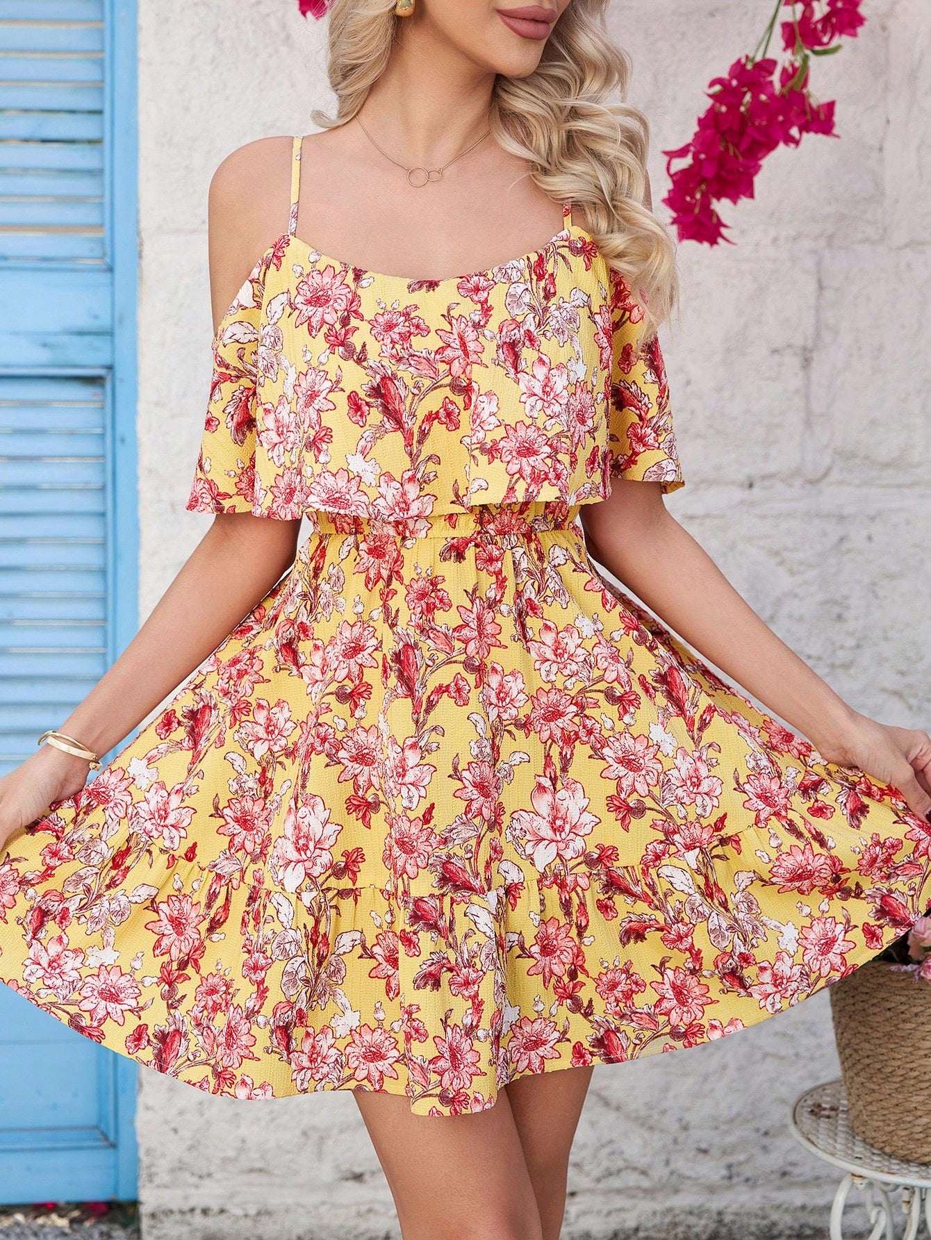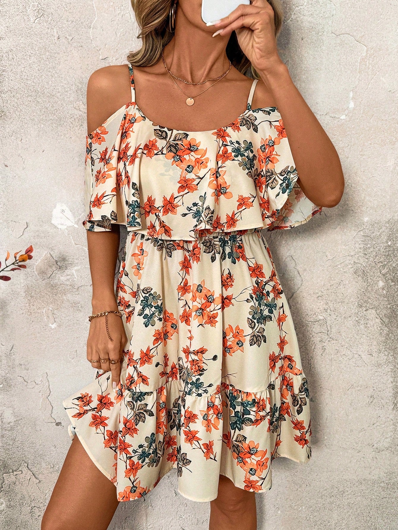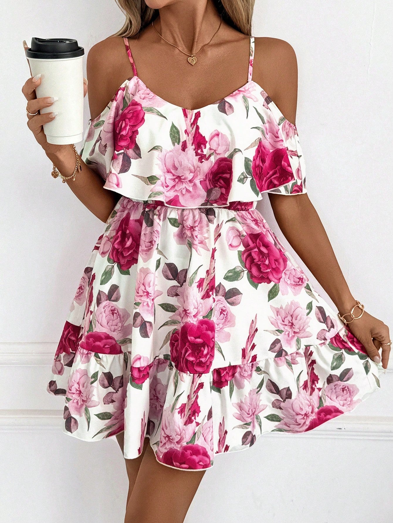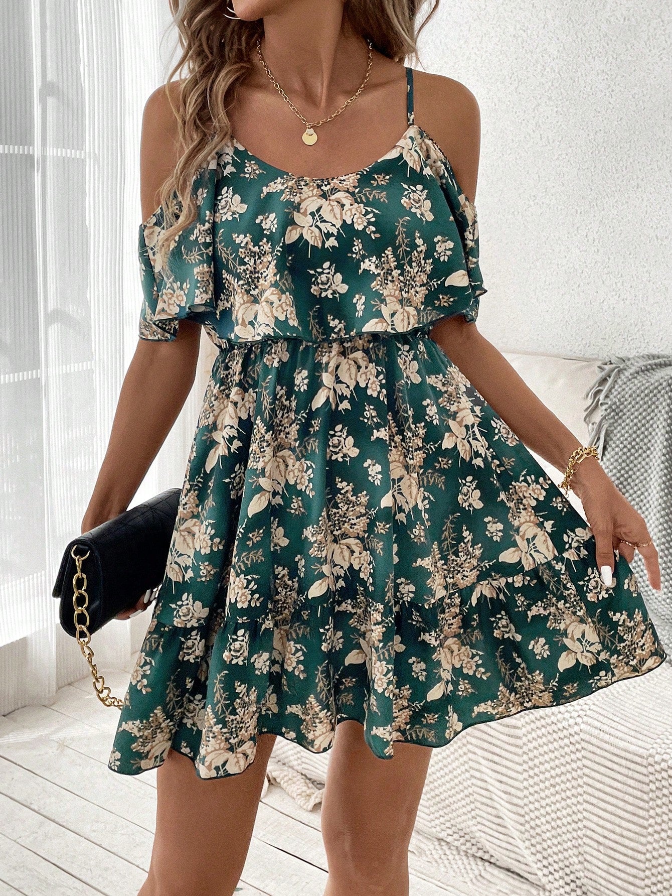 Robe d'été de vacances pour femmes avec épaules nues et ourlet à volants, imprimé floral et de plantes romantiques