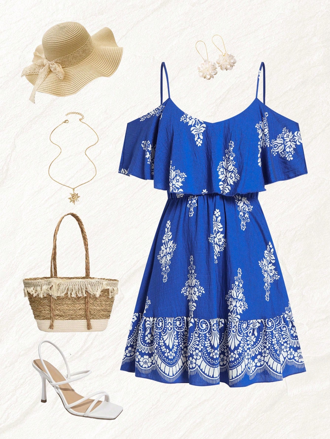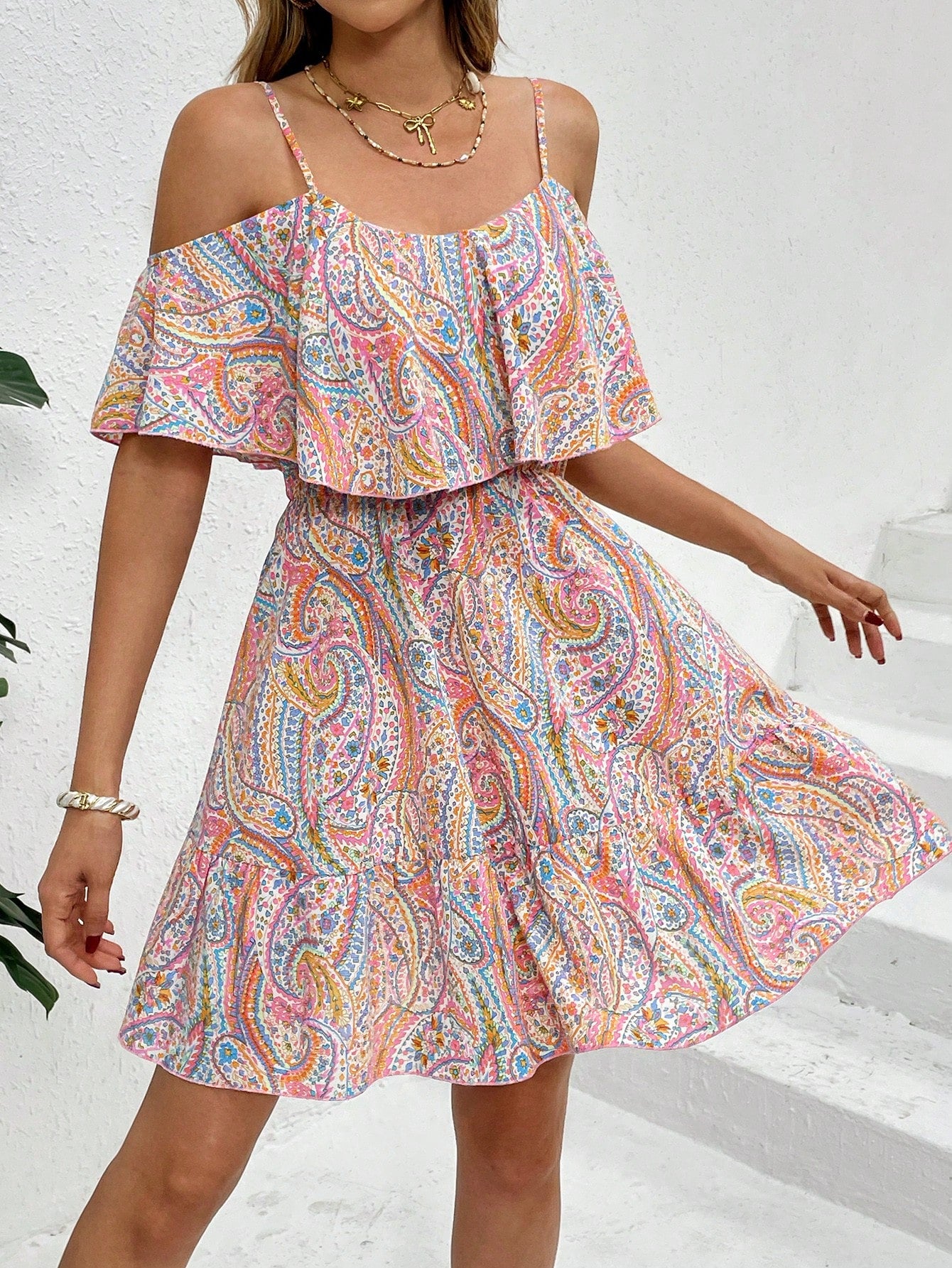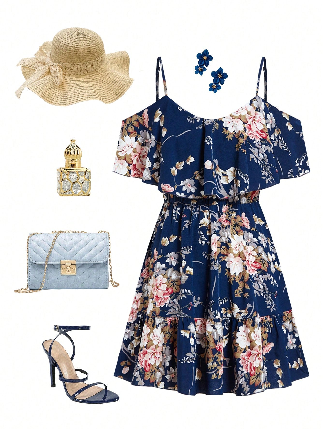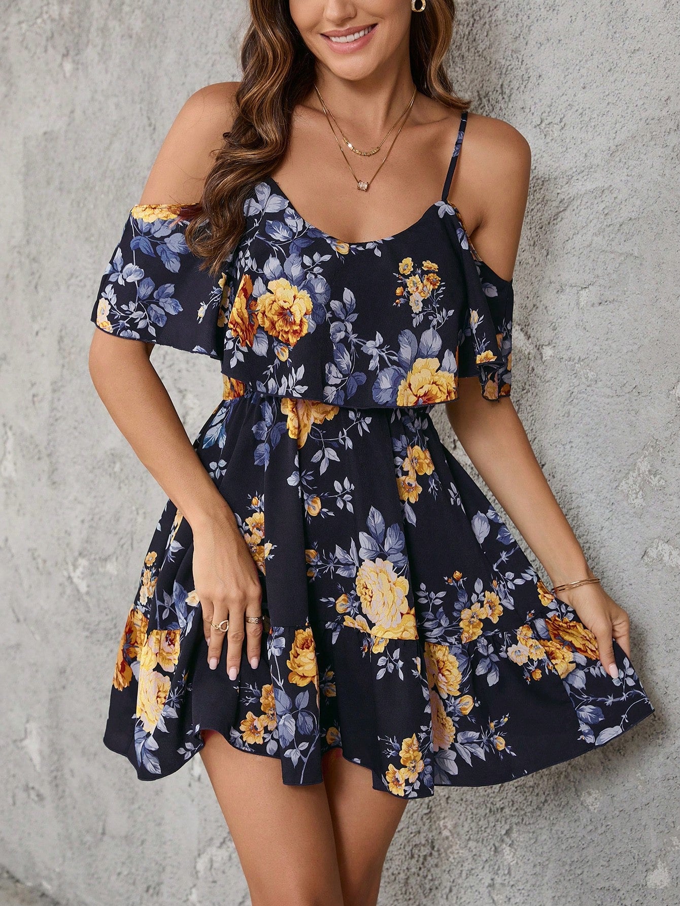 Robe d'été de vacances pour femmes avec épaules nues et ourlet à volants, imprimé floral et de plantes romantiques