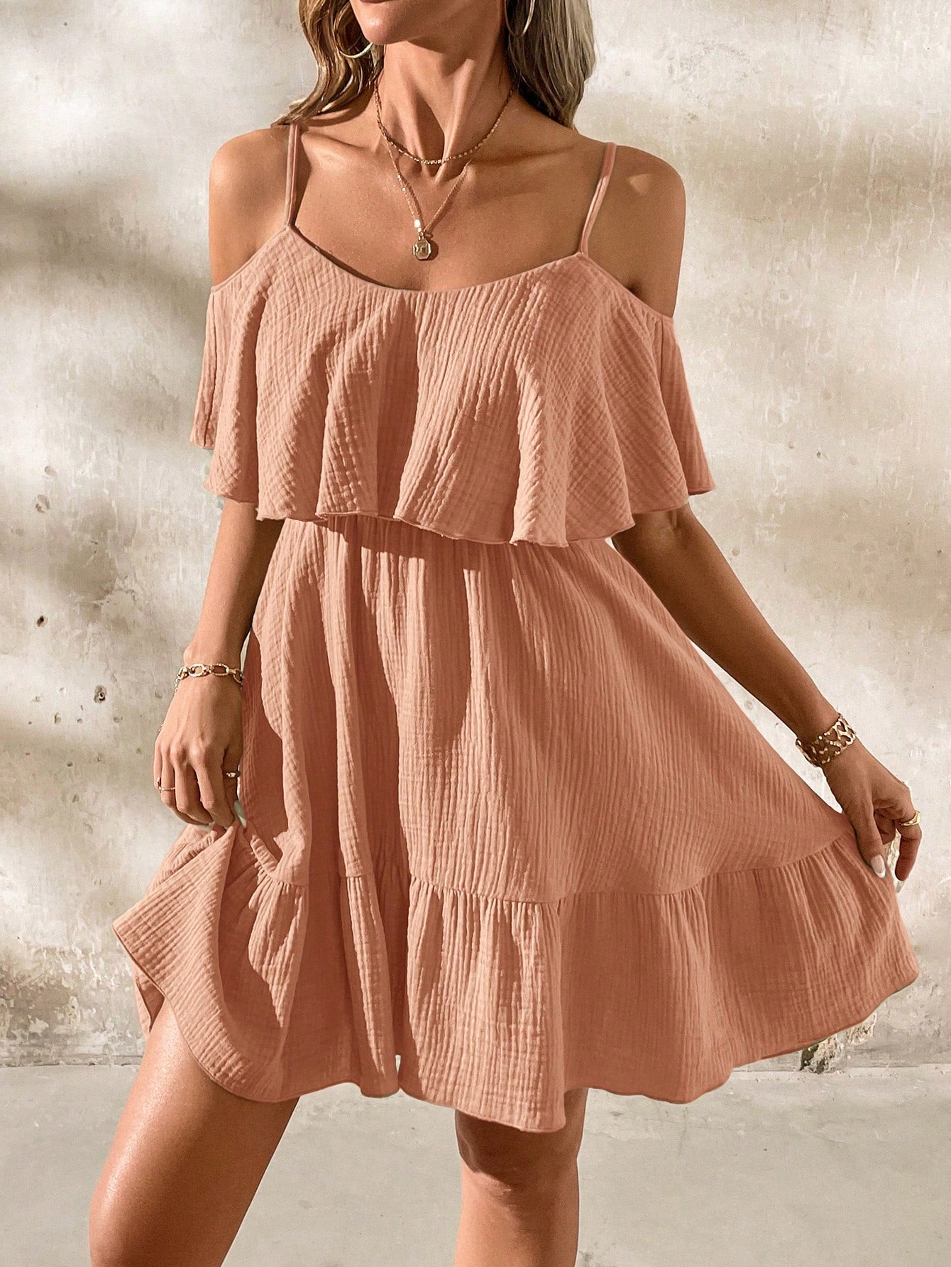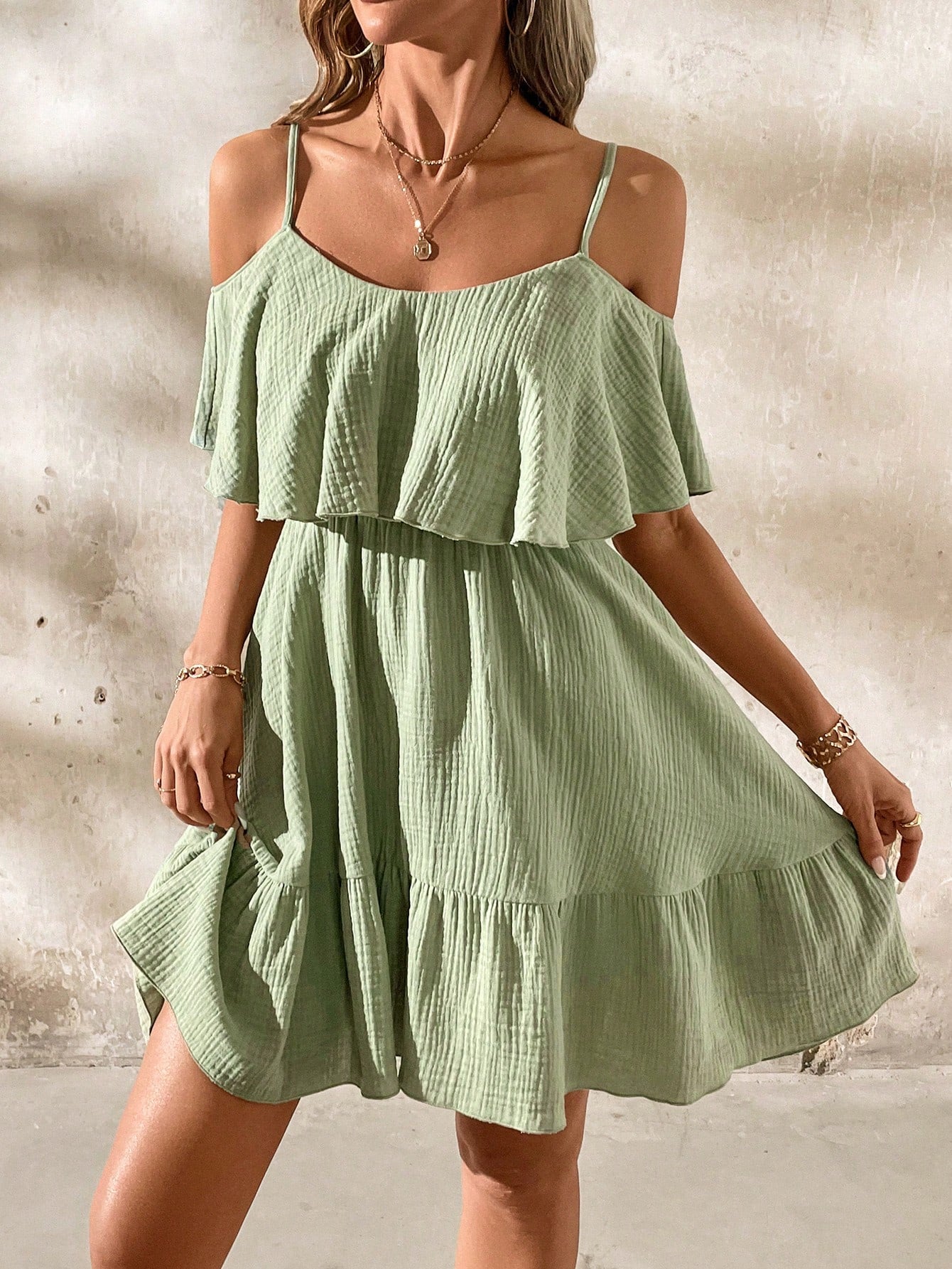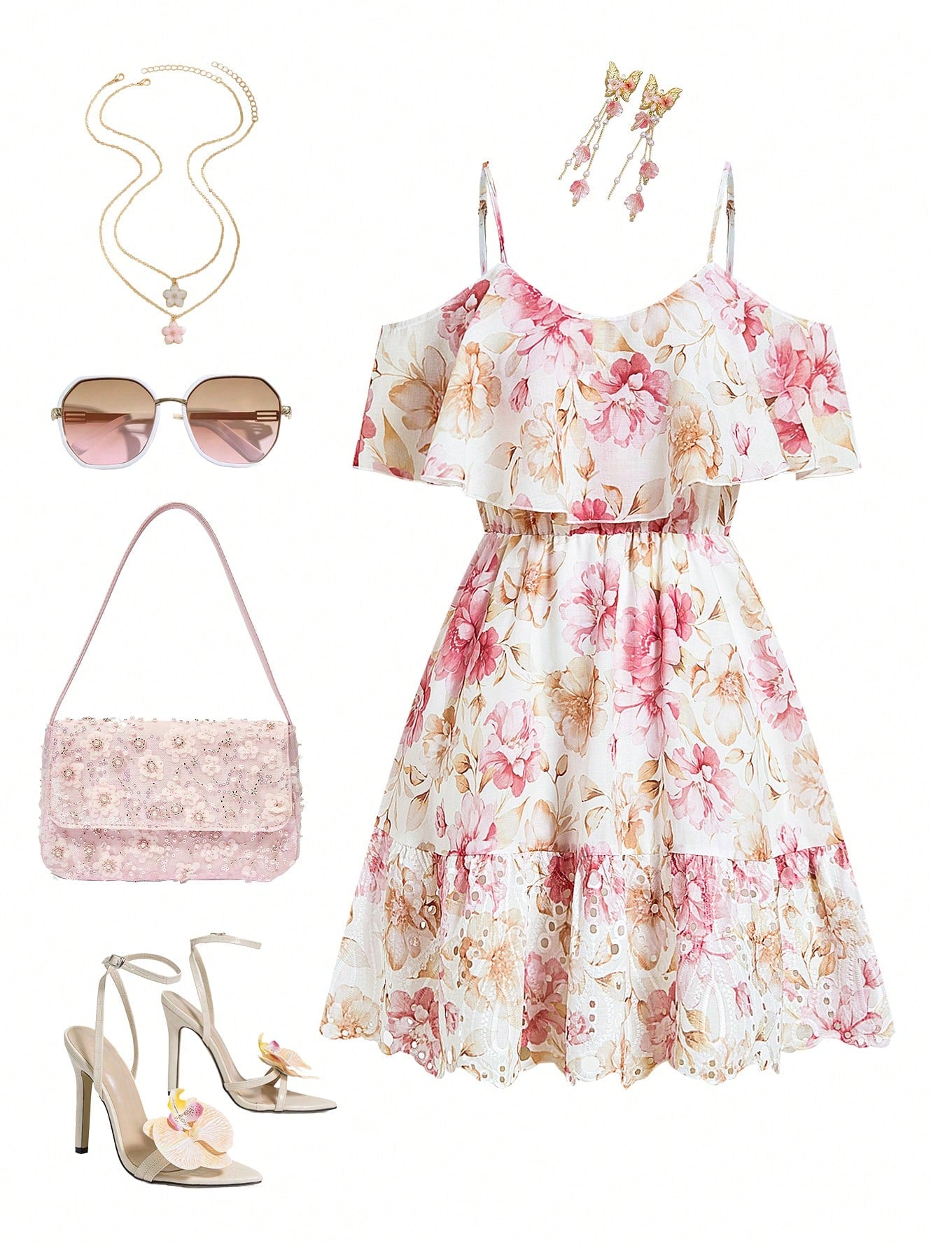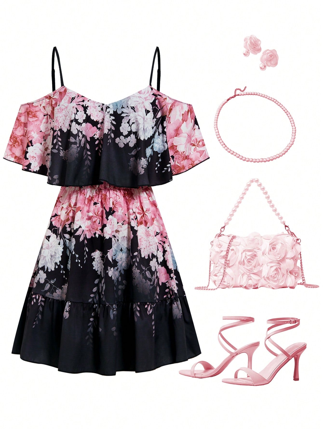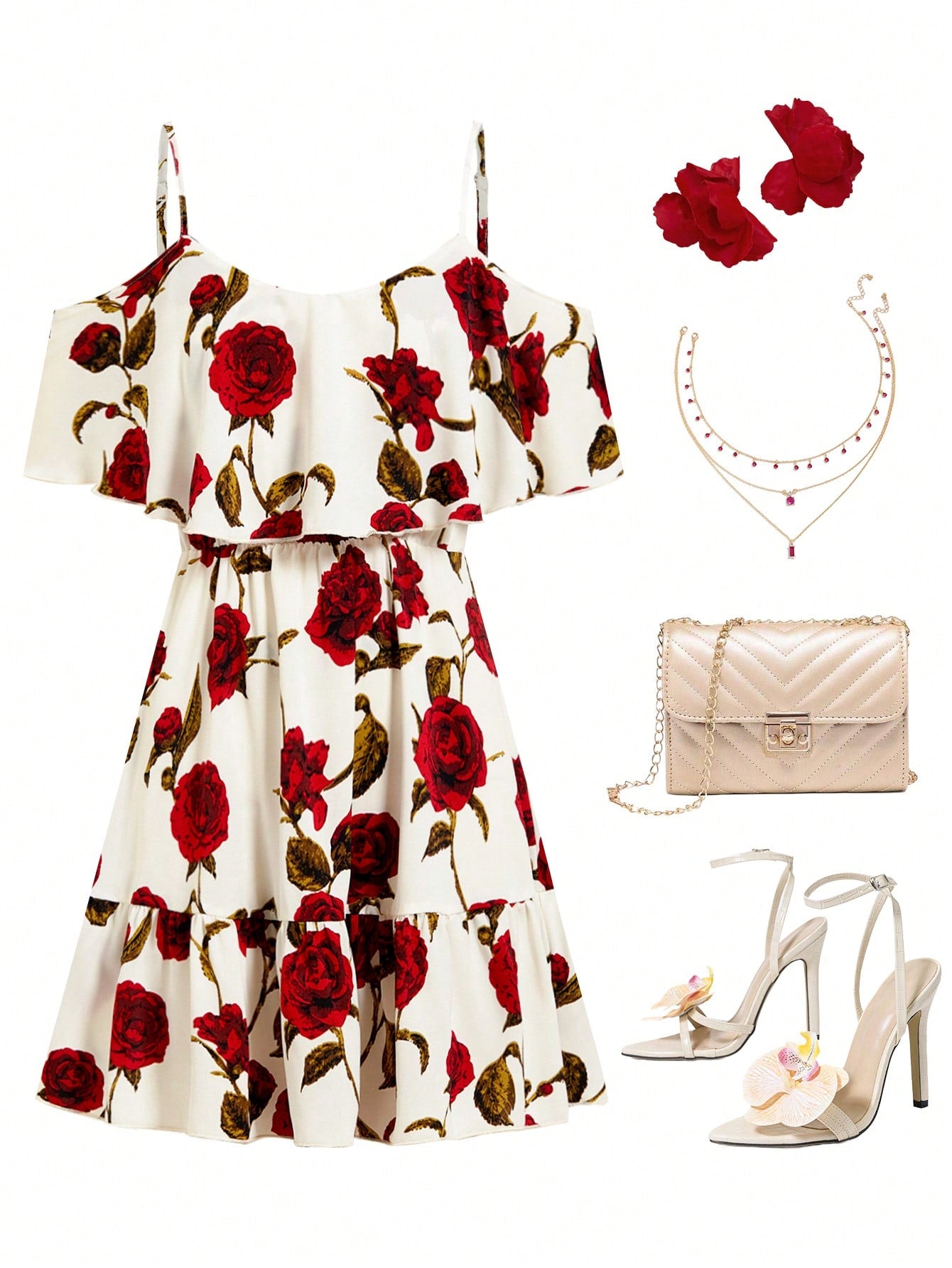 Robe d'été de vacances pour femmes avec épaules nues et ourlet à volants, imprimé floral et de plantes romantiques